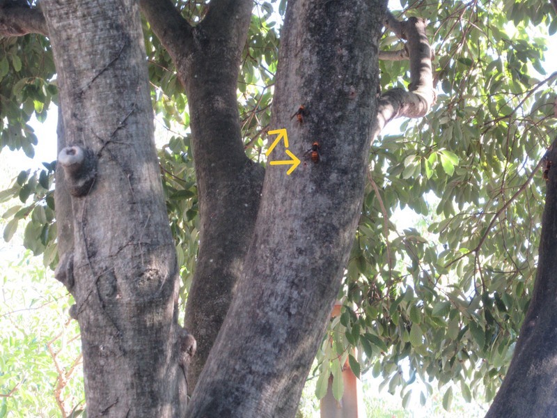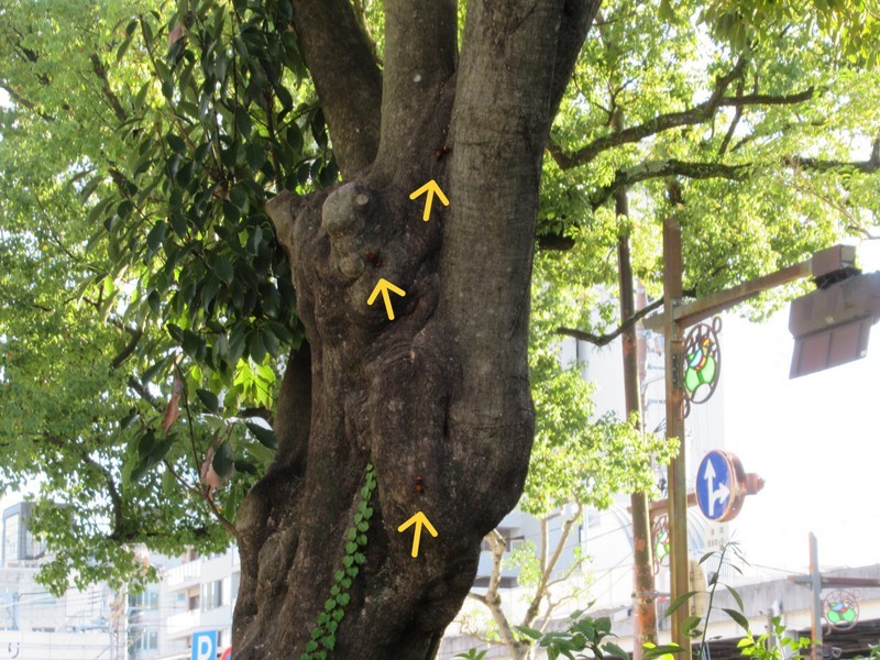 駐車場の西の方にある木にオオスズメバチが集まってきています。専門家の方によると、樹木並びに周辺に巣を作っている痕跡はなく、巣の材料集め及び樹液を舐めに来ているとのことです。