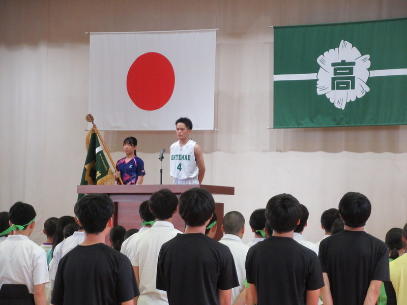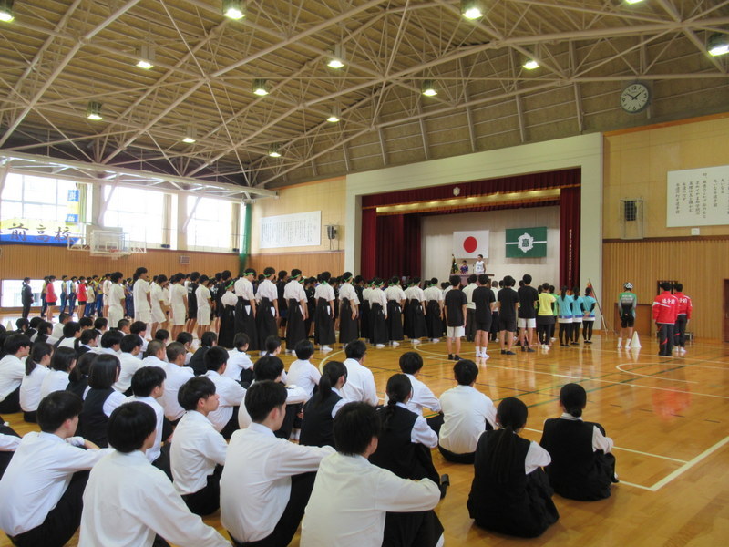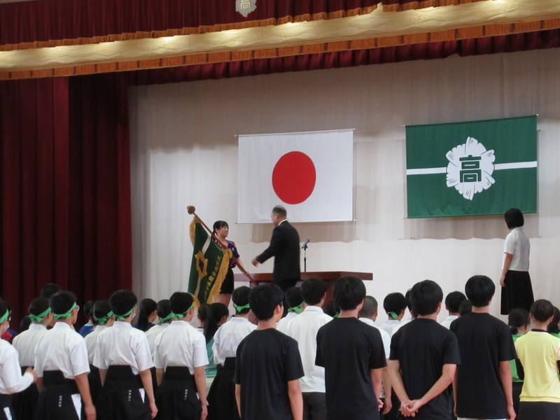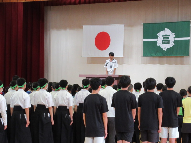 5月23日(金)の午後、令和7年度の県体壮行式を行いました。吹奏楽部の演奏の中、県体に出場する部活動が入場し、校長先生から騎手に校旗が授与され、校長先生、生徒会長から激励の言葉をいただきました。その後、今年の一文字「燃」が披露され、選手団長からは県体への意気込みを含めた挨拶がありました。